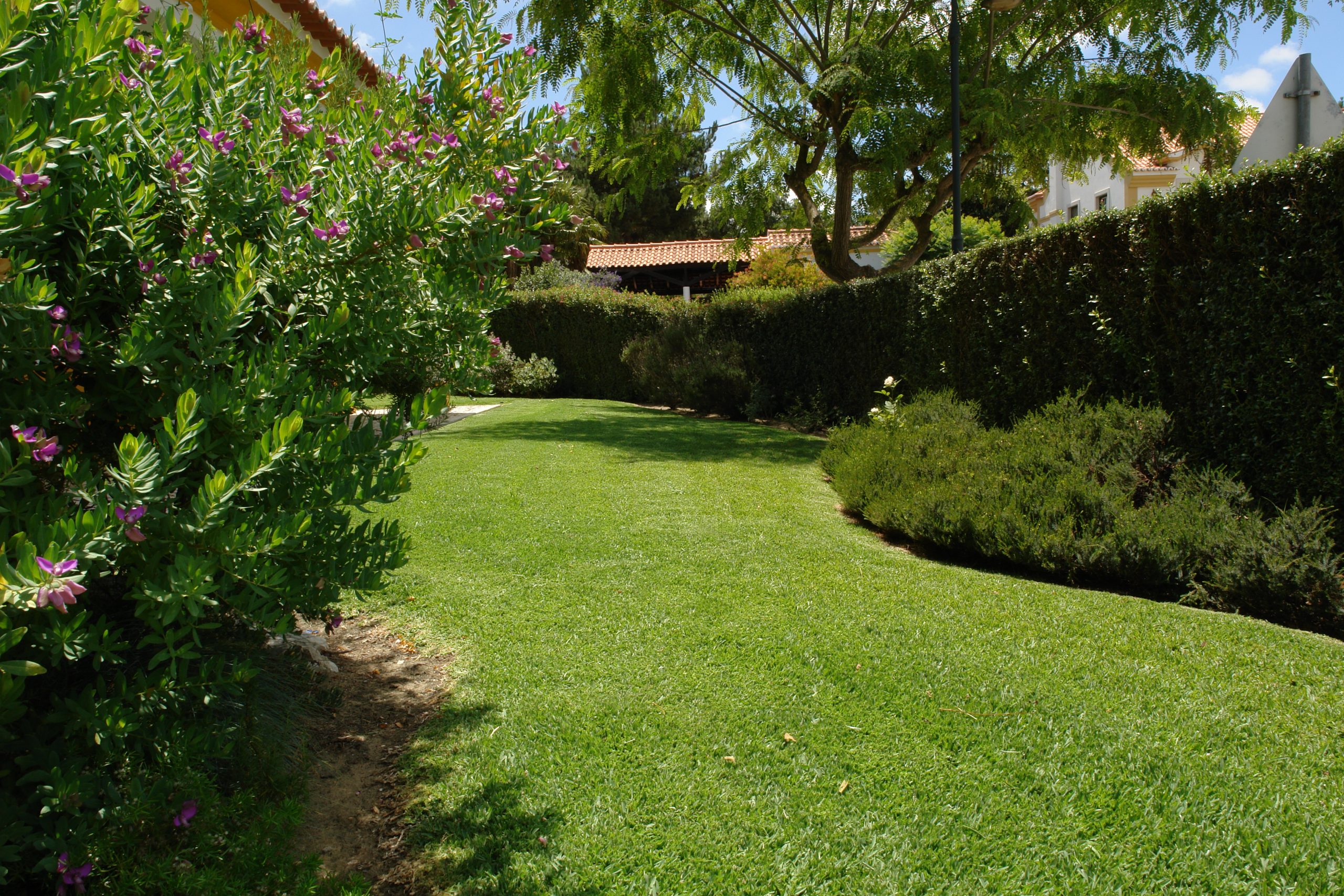 Relvado natural, zonas exteriores, sebes e zonas arbustivas.