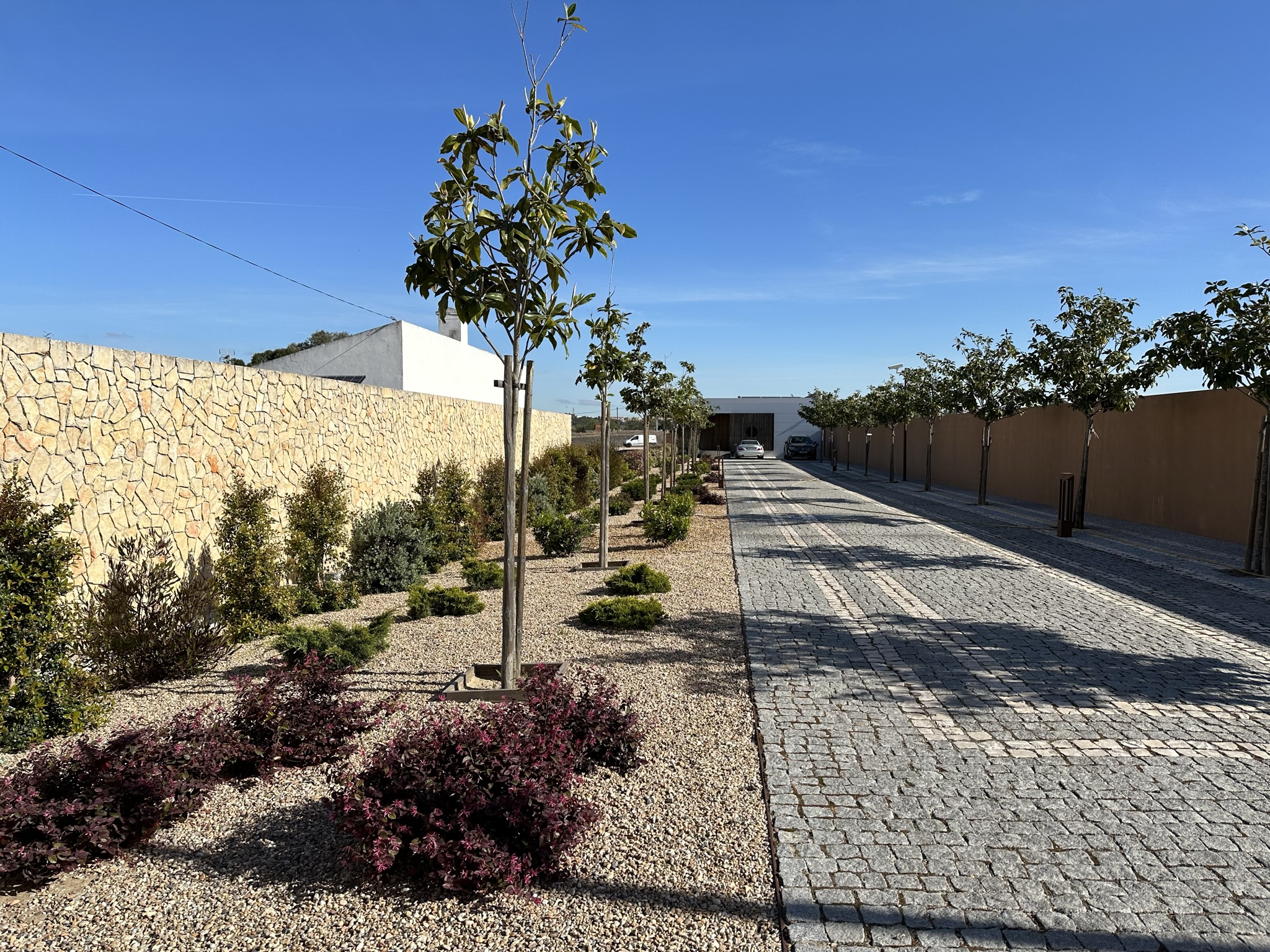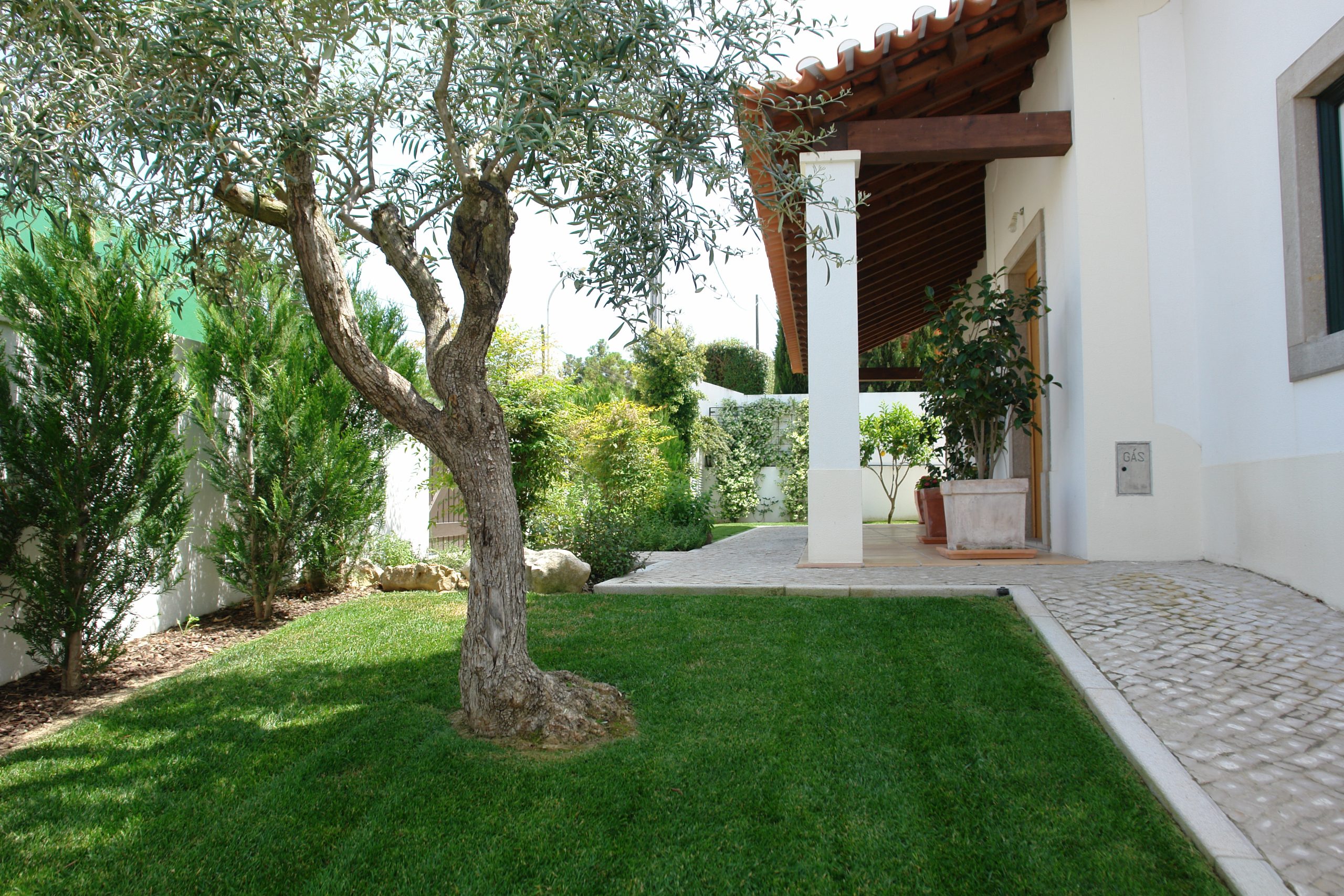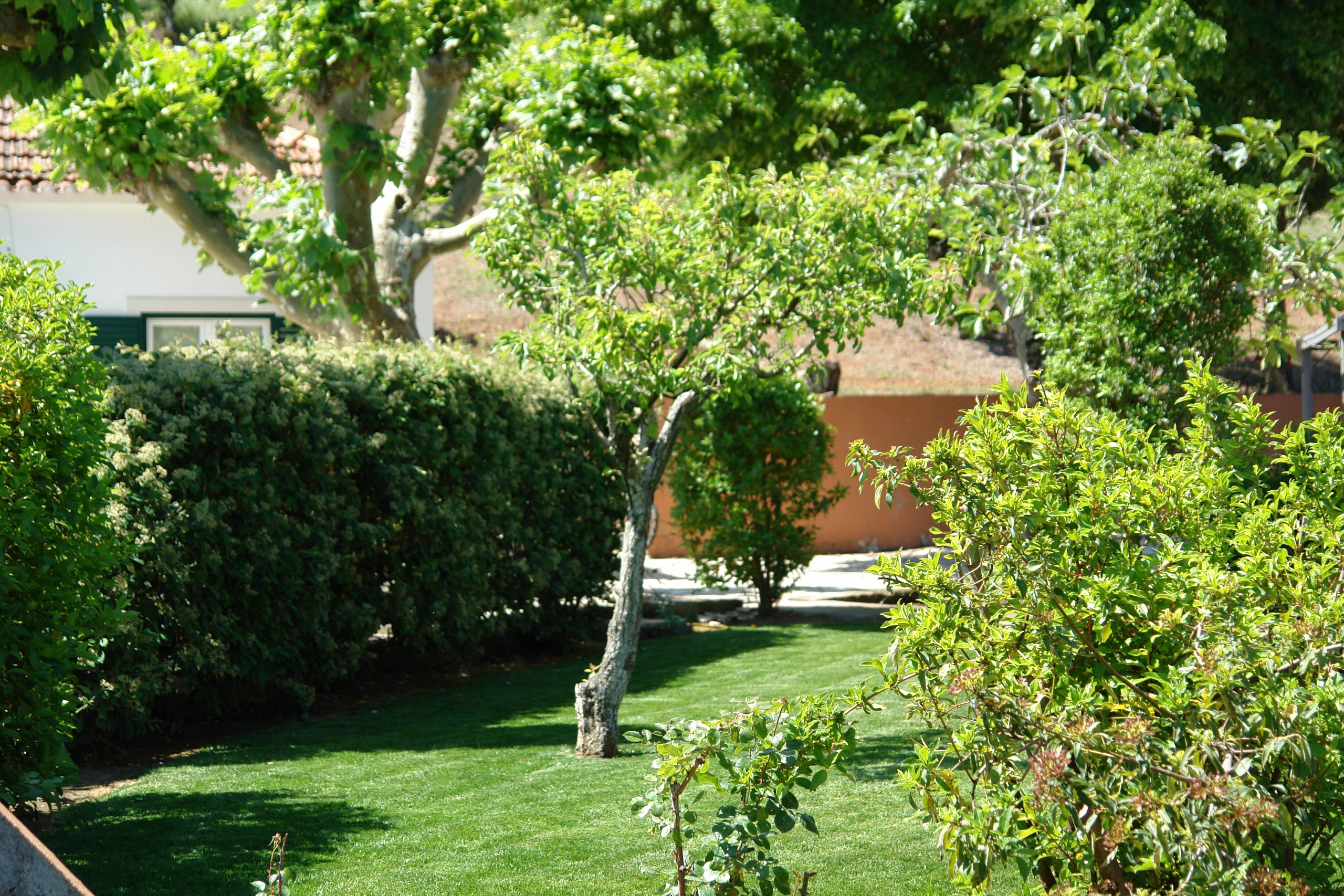 Zonas exteriores envolvente da moradia. Composição: Relvado natural, sebes exteriores e zonas arbustivas.